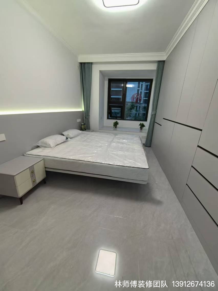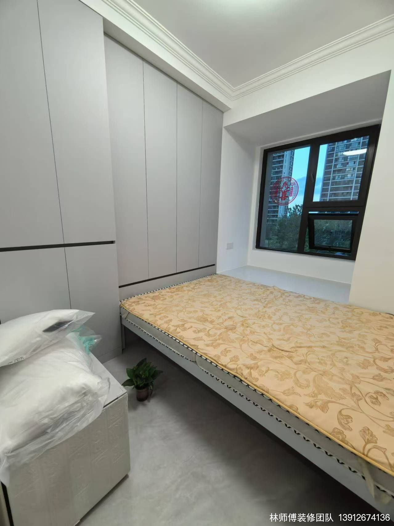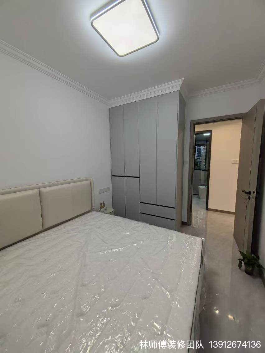 次卧是软包大床+衣柜,舒适之外,还有大大的收纳空间。