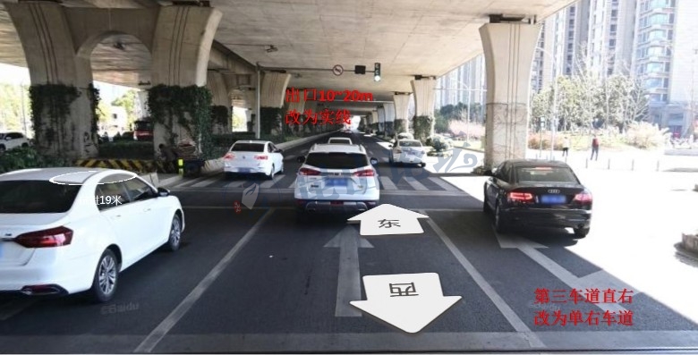 2、出口3车道虚线约10~20mm距离改为实线,使直行车和白塔路南向东右转互不干涉,右转无盲区,且避免跨多车道压实线转弯。