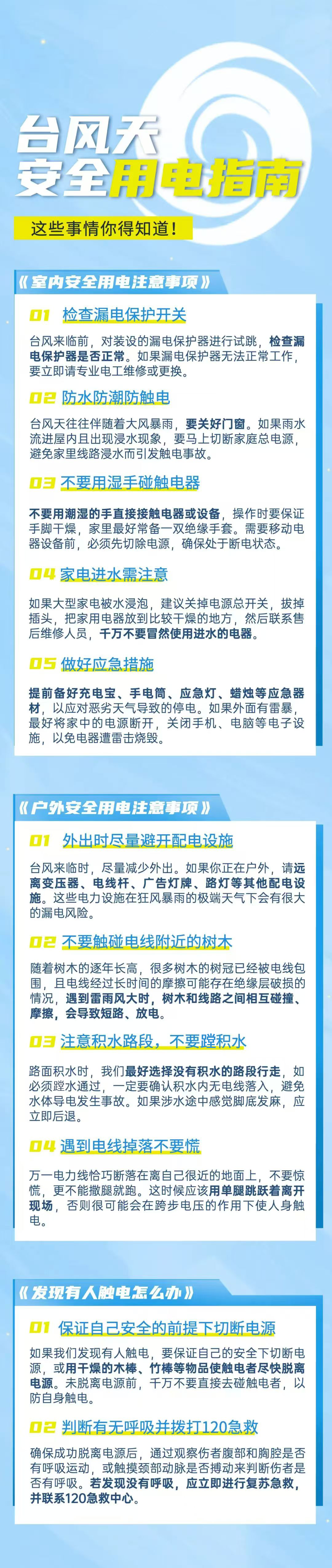 台风天往往伴随降雨,遭遇雷雨等极端天气尽量减少外出,远离电线杆、配电变压器台架等设施,如发现供电线路断落、供电设备浸水,应当远离避免触电,并及时拨打供电24小时抢修服务热线95598。