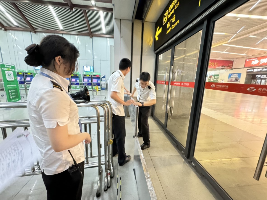 在1号线狮子山站、西环路站、相门站,2号线石路站、3号线东方之门站、宝带路站,4号线乐桥站、察院场站,5号线劳动路站,6号线拙政园苏博站等毗邻大型商业、著名景点的车站,工作人员提前固定或移除可能因强风造成松动的物品和告示,同时对与周边商业区域、景区衔接的出入口开展安全隐患巡查,对悬挂加密检查频次,防止悬挂物掉落对乘客的出行安全造成影响。