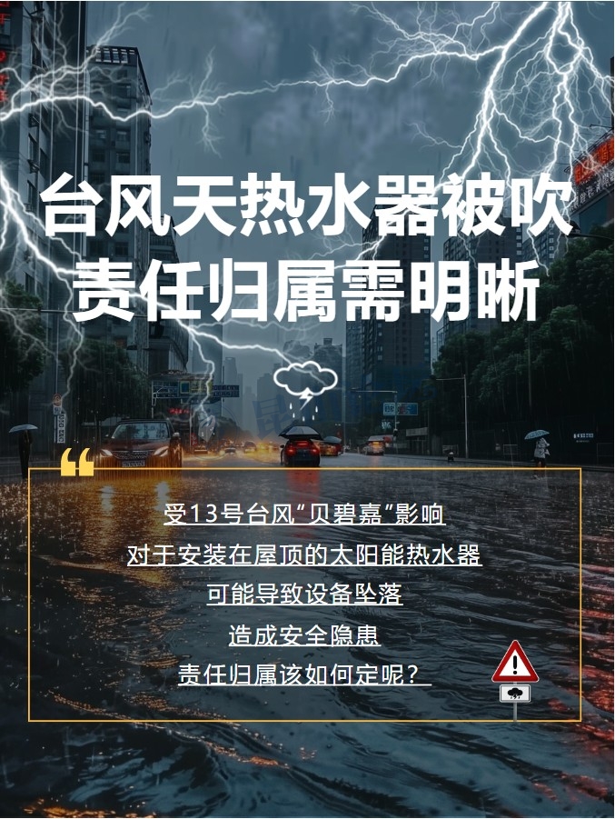 在台风等恶劣天气可能出现的时期,我们有必要明晰一个常见问题的责任归属——那就是台风天气太阳能热水器被吹落相关责任。