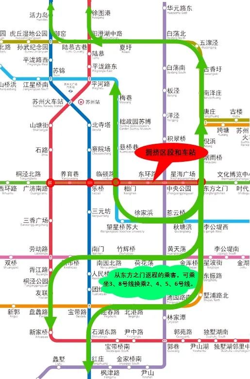 3.预计19:00-22:00,1号线东方之门站往木渎方向的车厢及站台将出现严重拥挤,建议通过3/8号线换乘其他线路返程。如下图所示: