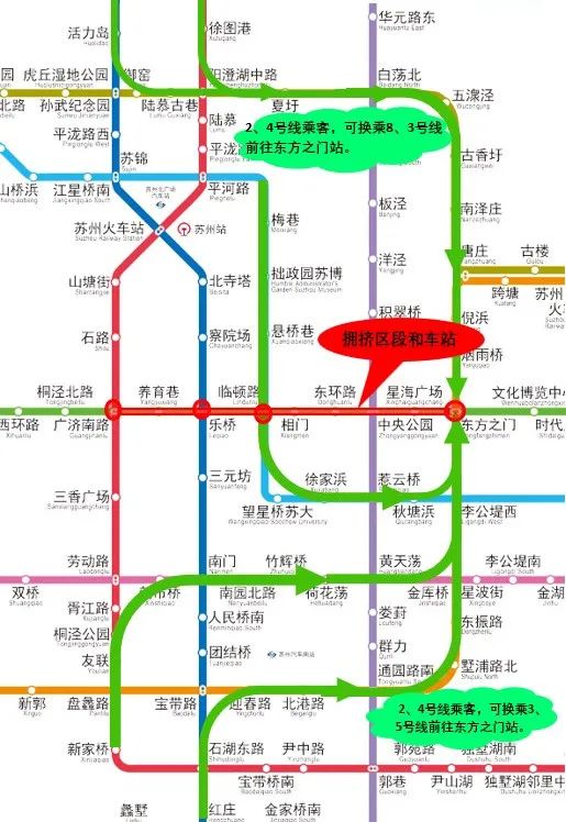 2.预计每天13:00-19:00广济南路站、乐桥站、临顿路站会出现换乘大客流,1号线往东方之门方向的站台及车厢出现严重拥挤,乘客一般需要排队等候多列车才能上车,建议提前换乘3/8号线前往东方之门站。