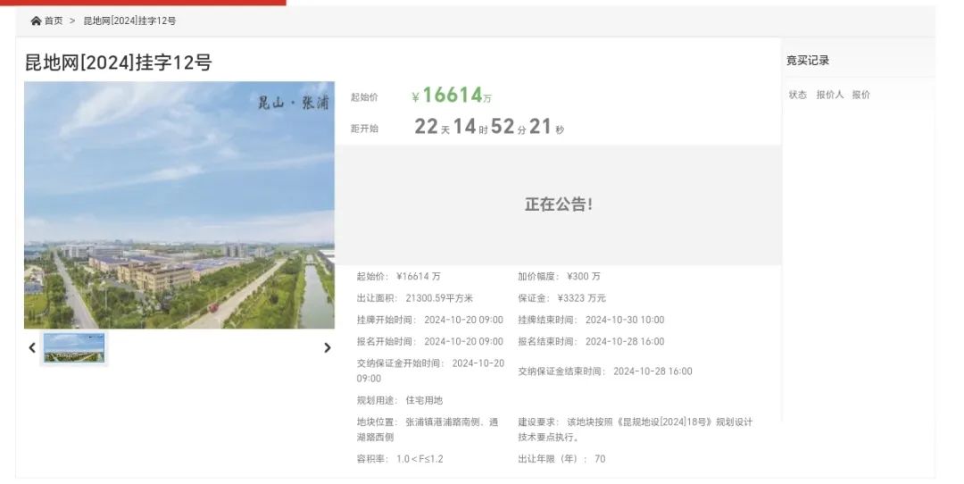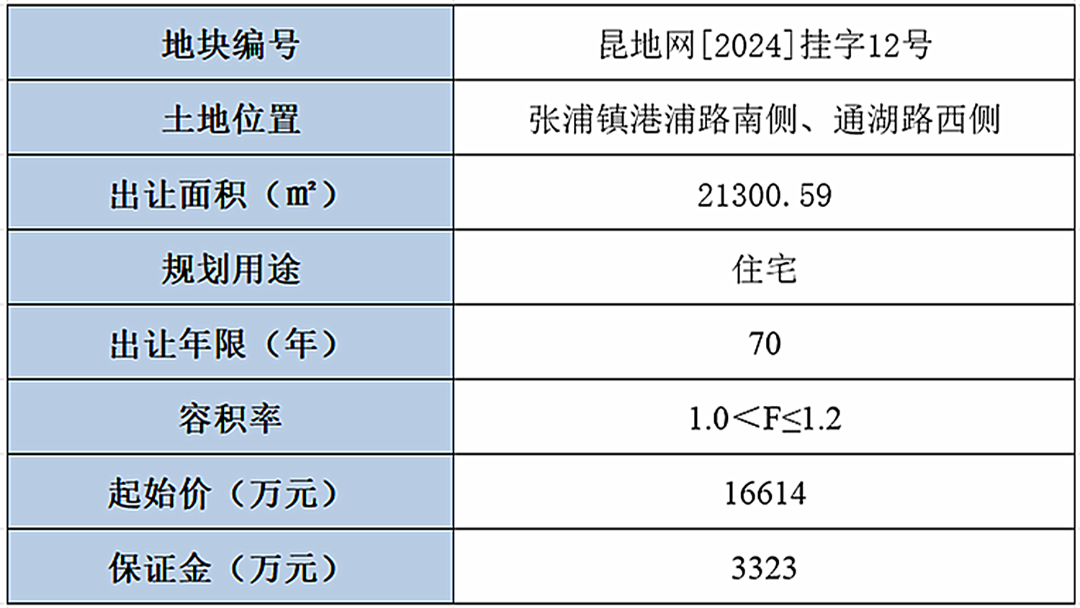 9月27日,昆山市自然资源和规划局发布昆地网[2024]挂字12号公告,挂出1宗位于张浦镇的住宅用地。该地块位于张浦镇港浦路南侧、通湖路西侧,出让面积21300.59㎡(约31.95亩)。地块公告期至2024年10月19日,正式报名时间为2024年10月20日9:00起至2024年10月28日下午16:00,并于2024年10月30日上午10:00准时进入限时竞价。