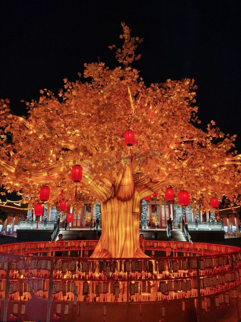 后山花园内的建筑配上具有水乡元素的氛围灯具,营造出江南水乡田园感。凌霄宝塔在艺术光影和多媒体效果的渲染下,幻化为一座光彩夺目的“玲珑宝塔”光影地标,呈现出宏伟大气的形象,引来市民游客纷纷拍照留念。前来赏灯的市民李女士感叹道:“能够欣赏这么精美的彩灯,真是一场视觉的盛宴!”