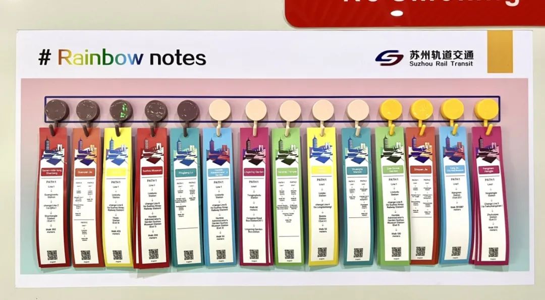 在外籍游客服务方面,苏州地铁在文化博览中心站、星湖街站、苏州火车站和察院场站推出了英文版彩虹便签。