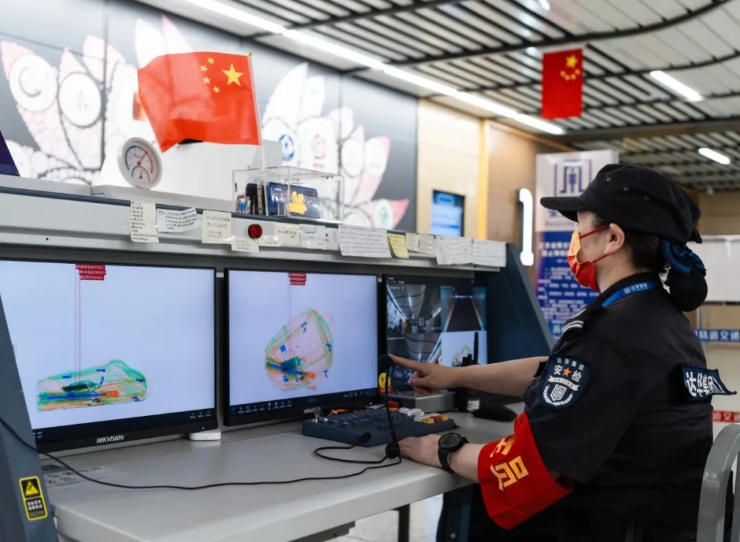 走到安检通道前,安检员们亲和礼貌的指引手势和话语“乘客您好,携带的包裹请过机安检”,引导着乘客们有序安检。苏州地铁严格落实“逢包必查、逢液必检、逢疑必问”的工作要求。