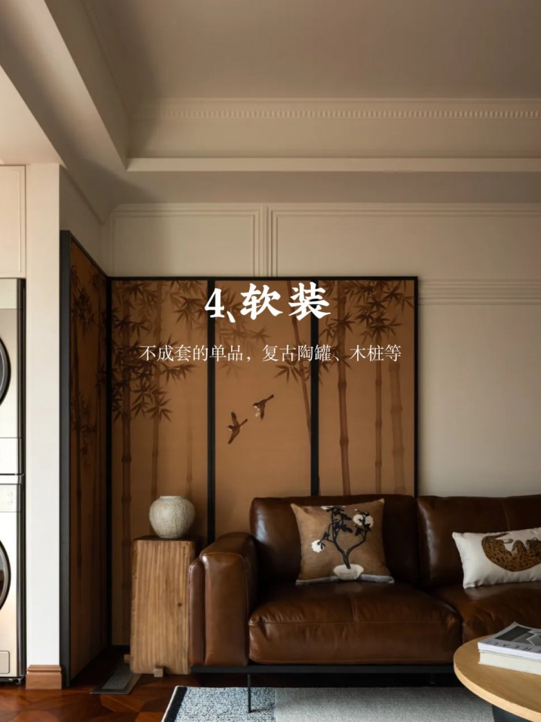 3、材质:擅长用不同的材料打造层次感,可以将实木、皮革、布艺藤编等自然材质与金属、玻璃等现代元素结合,营造出复古现代的质感,大面积材料尽量选哑光的。