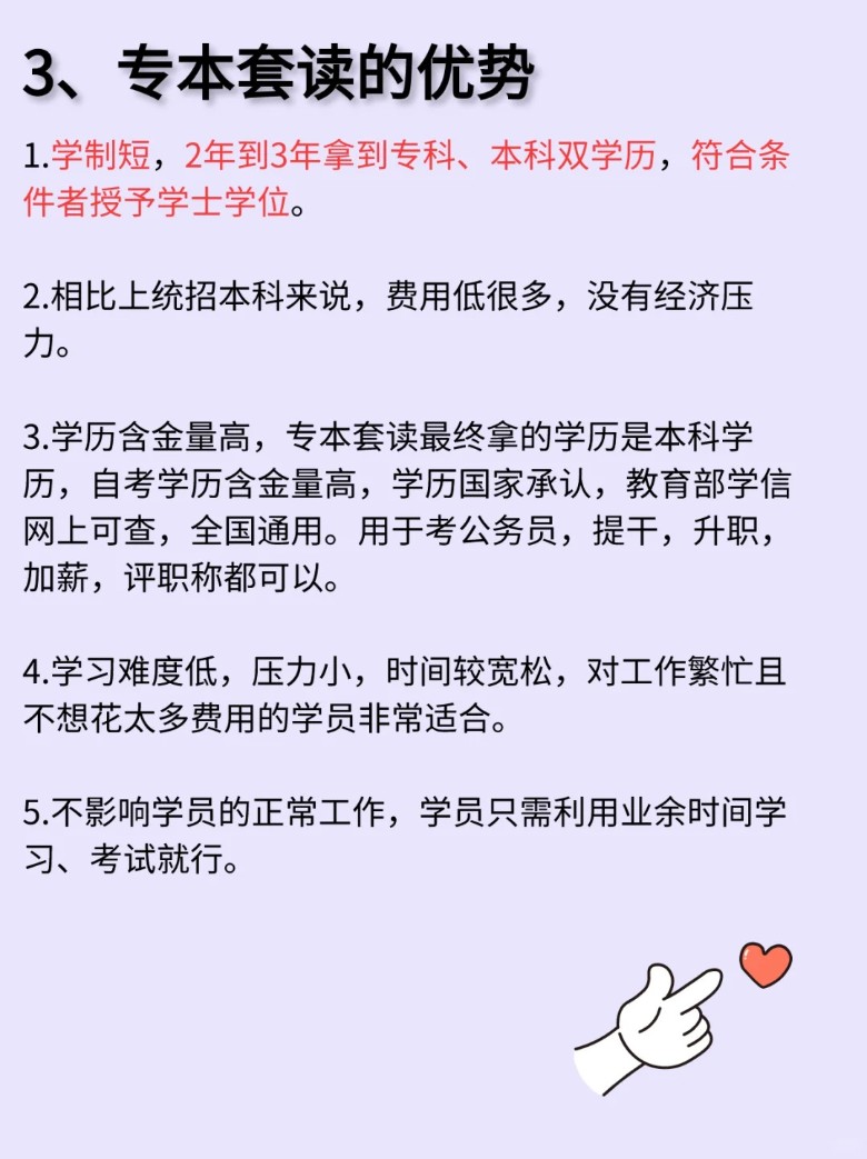 另外专本连读的话考生毕业时间就长一点,先高升专再专升本需要4-5年左右的时间,而专本套读只需要2-3年就可以申请毕业。