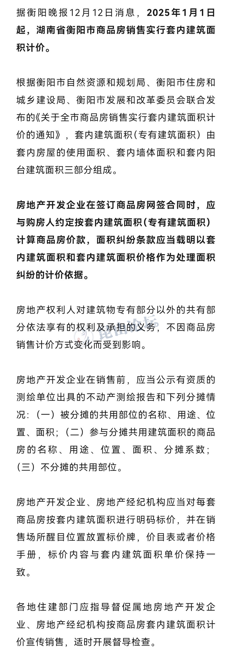 湖南省衡阳市官宣:从明年(2025年)1月1日起,商品房按套内建筑面积(专有建筑面积)计价销售。