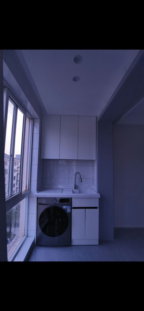 洗衣机从洗手间挪到阳台,洗晒一起,更加方便。而且洗衣机的上面还做了吊柜,辅助家里收纳。由于阳台在卧室外,因此不同于以往的打通设计,这里加上移门,隔音效果更佳,能让人睡得更安稳。