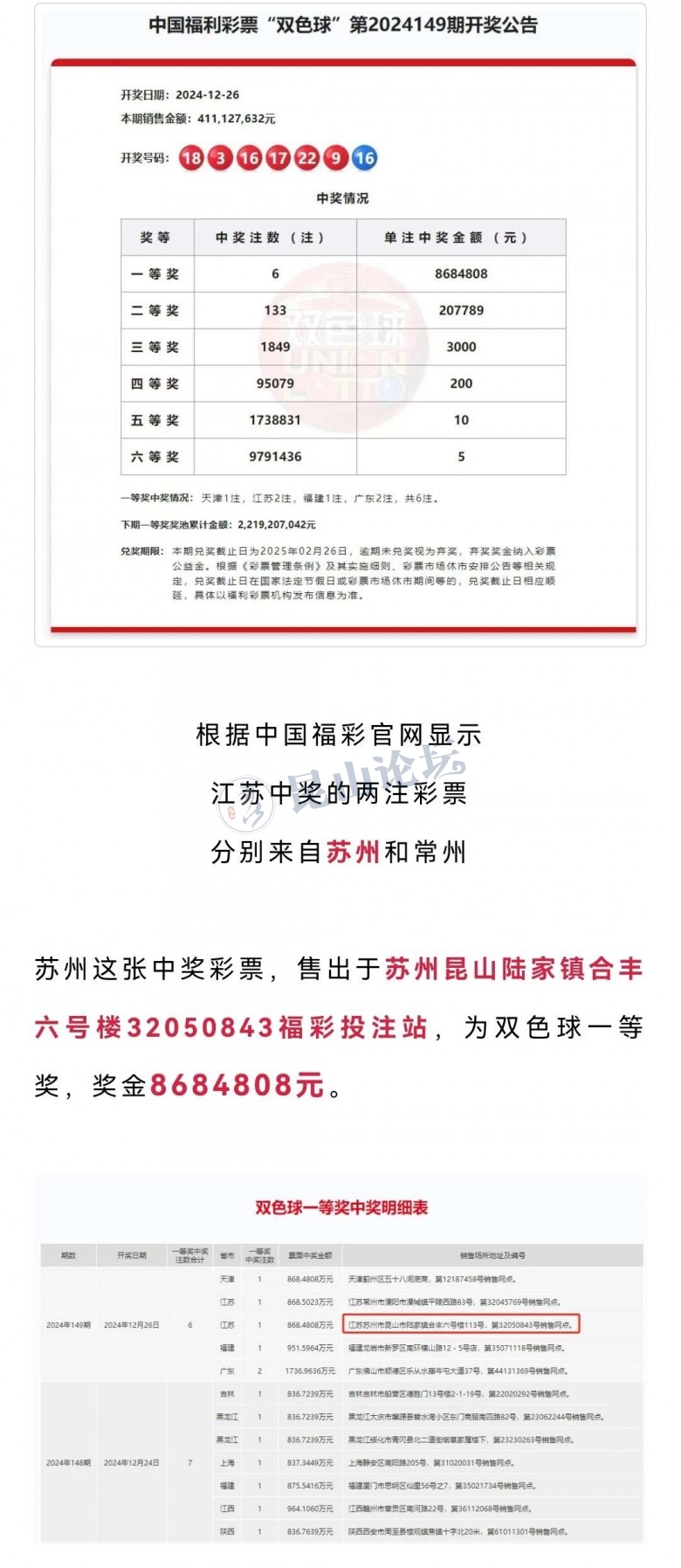 苏州这张中奖彩票,售出于苏州昆山陆家镇合丰六号楼32050843福彩投注站,为双色球一等奖,奖金8684808元。
