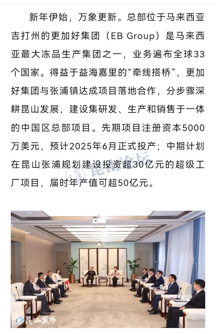 2025年1月1日,马来西亚更加好食品中国区总部项目签约落户张浦镇益海嘉里丰厨(昆山)央厨园区,张浦喜迎新年项目落地“第一签”,获得新华网、中国经济网、央广网 、中国新闻网、环球网、中国江苏网、交汇点新闻、江苏经济网、凤凰网、引力播、昆山日报等多家主流媒体关注报道。