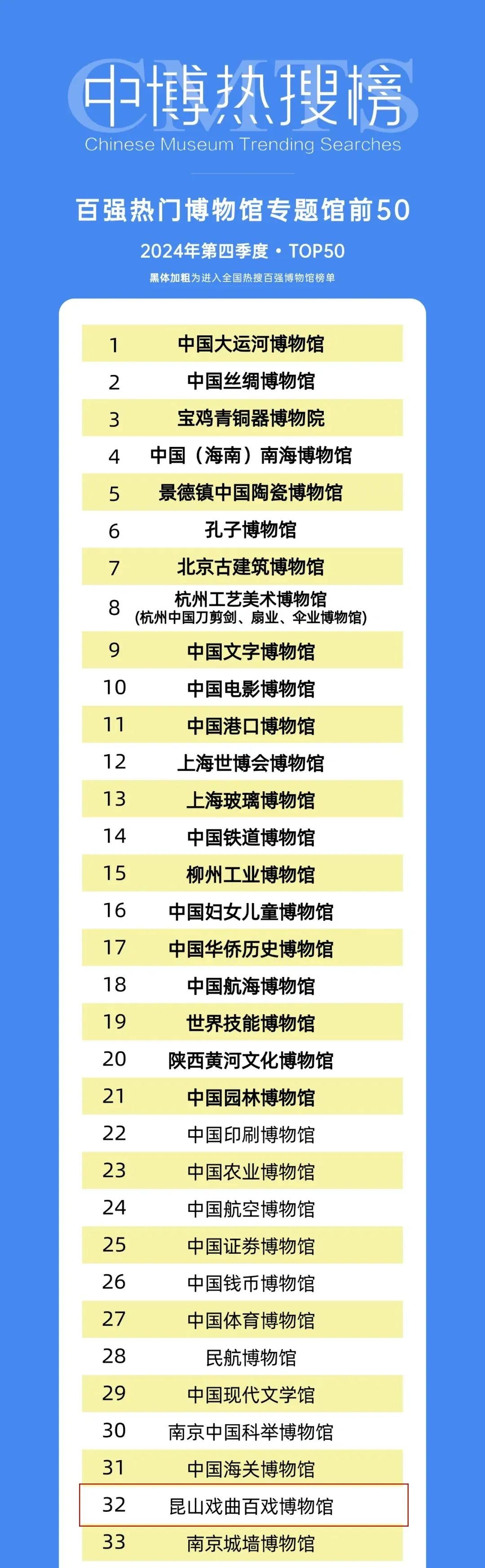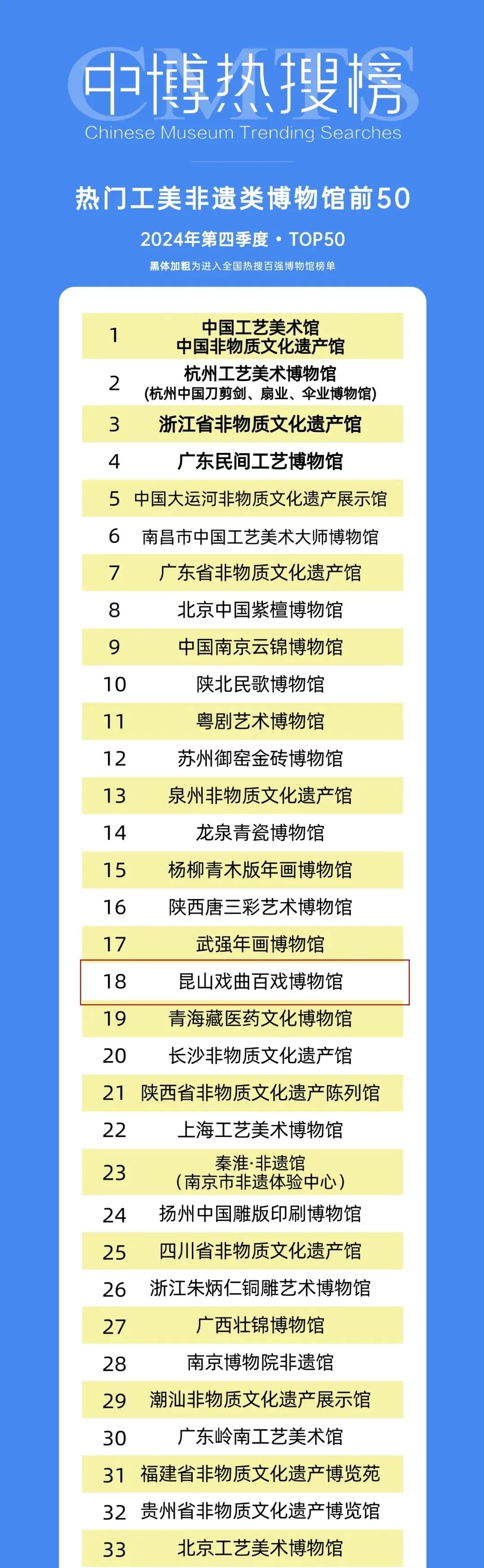 开馆至今,昆山戏曲百戏博物馆已是三度登榜。2024年4月,首次荣登热搜榜,入选2024年第一季度“百强热门博物馆新开馆前30”榜单;2024年10月第二次荣登热搜榜,入选2024年第三季度“热门工美及非遗类博物馆前30”榜单;2025年1月,入选2024年第四季度“热门工美非遗类博物馆榜单”“百强热门博物馆专题馆榜单”。多次荣登热搜榜榜单展现了昆山戏曲百戏博物馆的受欢迎程度和热度。