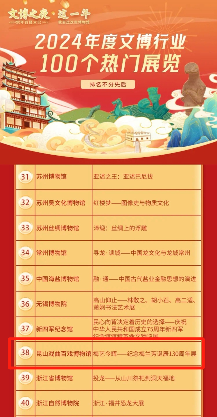 “梅艺今辉——纪念梅兰芳诞辰130周年展”入选“2024年度文博行业100个热门展览”“全国100家博物馆的100个热门展览”。