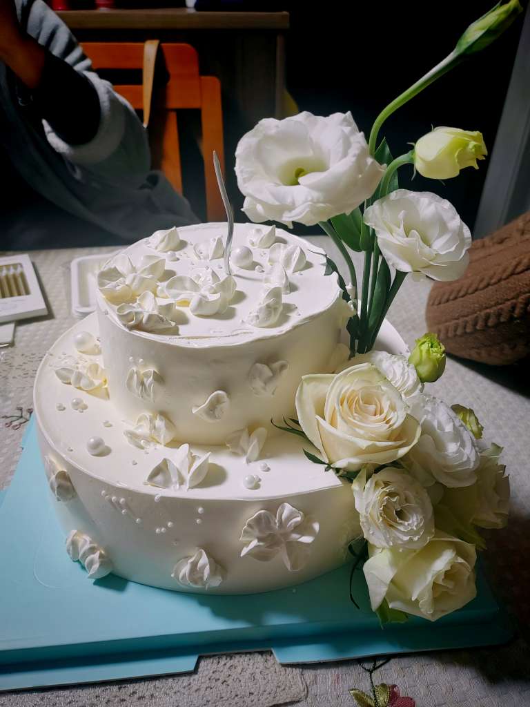 蛋糕下午送来了,盲盒已开~这次他选的纯白色,依旧是双层(偷偷告诉你们,他真的很爱吃甜品和吃蛋糕)。白色洋桔梗花语“纯洁无暇,永恒的爱”……当然,他不知道花语,而我,也是刚搜索的,图个开心~