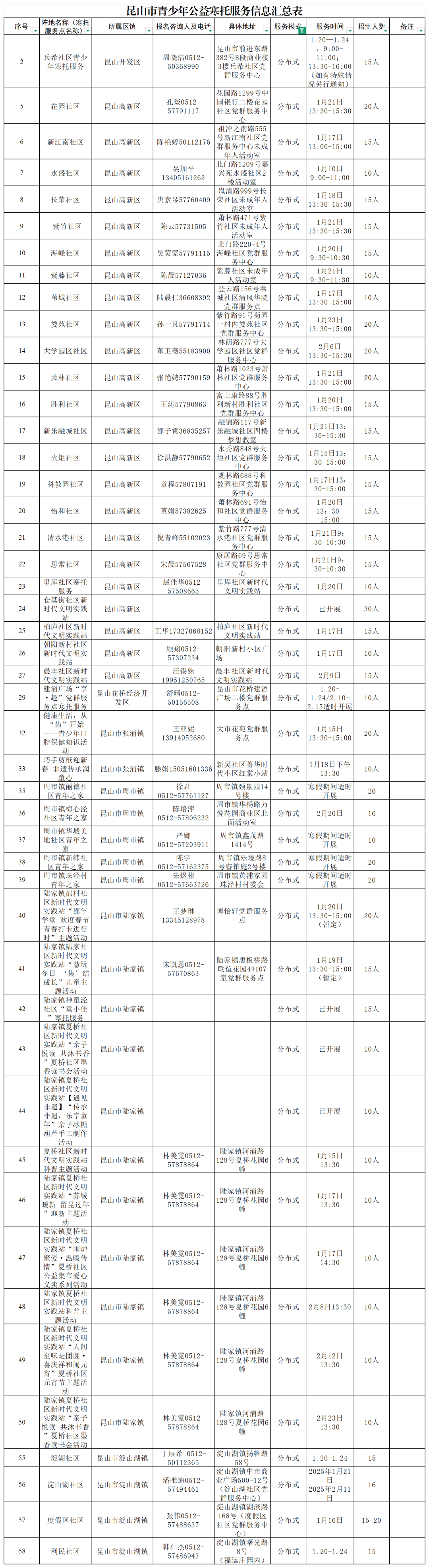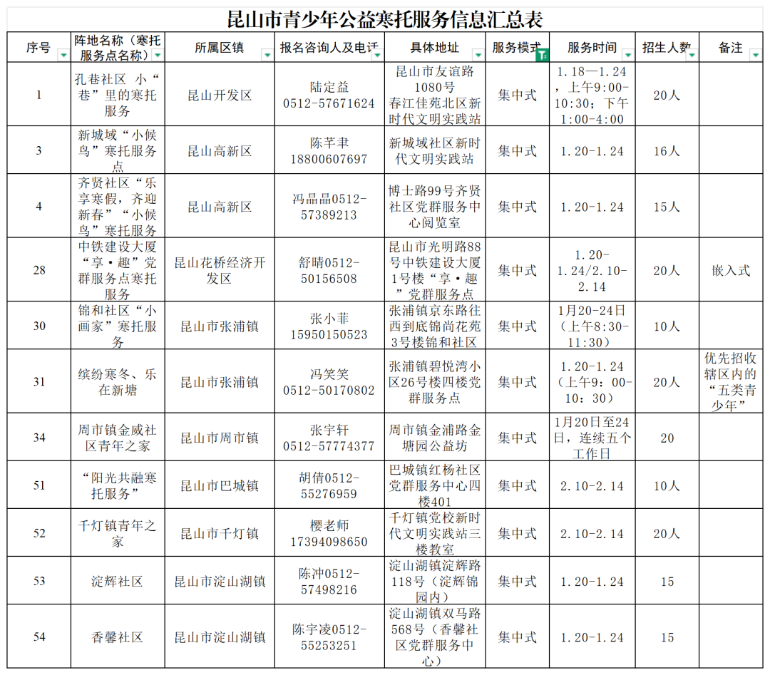 为满足广大家长需求、解决青少年寒假期间“看护难”问题,引导和帮助青少年度过一个安全、快乐、有意义的假期,苏州团市委牵头,联合苏州市委宣传部(市文明办)、苏州市教育局、苏州市民政局、苏州市总工会在全市组织开展2025年度苏州市青少年公益寒托服务项目。昆山市共开设寒托服务点58个,其中,集中式(嵌入式)寒托服务点11个,分布式寒托服务点47个。