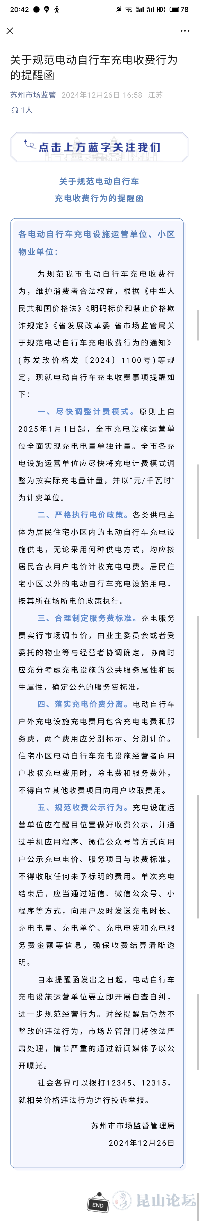 各电动自行车充电设施运营单位、小区物业单位:为规范我市电动自行车充电收费行为,维护消费者合法权益,根据《中华人民共和国价格法》《明码标价和禁止价格欺诈规定》《省发展改革委 省市场监管局关于规范电动自行车充电收费行为的通知》(苏发改价格发〔2024〕1100号)等规定,现就电动自行车充电收费事项提醒如下:一、尽快调整计费模式。原则上自2025年1月1日起,全市充电设施运营单位全面实现充电电量单独计量。全市各充电设施运营单位应尽快将充电计费模式调整为按实际充电量计量,并以“元/千瓦时”为计费单位。二、严格执行电价政策。各类供电主体为居民住宅小区内的电动自行车充电设施供电,无论采用何种供电方式,均应按居民合表用户电价计收充电电费。居民住宅小区以外的电动自行车充电设施用电,按其所在场所电价政策执行。三、合理制定服务费标准。充电服务费实行市场调节价,由业主委员会或者受委托的物业等与经营者协调确定,协商时应充分考虑充电设施的公共服务属性和民生属性,确定公允的服务费标准。四、落实充电价费分离。电动自行车户外充电设施充电费用包含充电电费和服务费,两个费用应分别标示、分别计价。住宅小区电动自行车充电设施经营者向用户收取充电费用时,除电费和服务费外,不得自立其他收费项目向用户收取费用。五、规范收费公示行为。充电设施运营单位应在醒目位置做好收费公示,并通过手机应用程序、微信公众号等方式向用户公示充电电价、服务项目与收费标准,不得收取任何未予标明的费用。单次充电结束后,应当通过短信、微信公众号、小程序等方式,向用户及时发送充电时长、充电电量、充电单价、充电电费和充电服务费金额等信息,确保收费结算清晰透明。自本提醒函发出之日起,电动自行车充电设施运营单位要立即开展自查自纠,进一步规范经营行为。对经提醒后仍然不整改的违法行为,市场监管部门将依法严肃处理,情节严重的通过新闻媒体予以公开曝光。社会各界可以拨打12345、12315,就相关价格违法行为进行投诉举报。苏州市市场监督管理局2024年12月26日