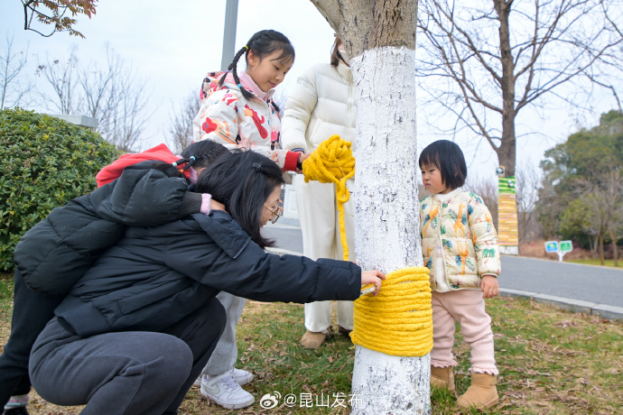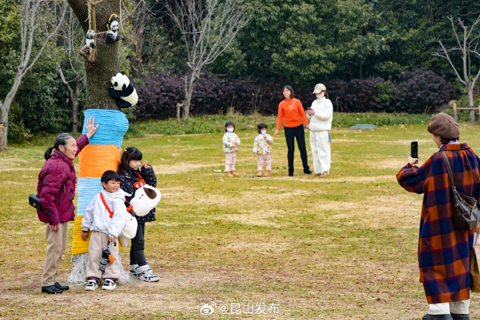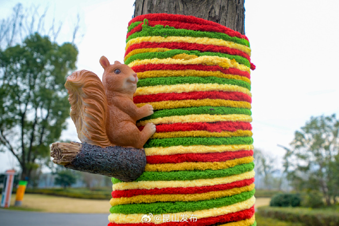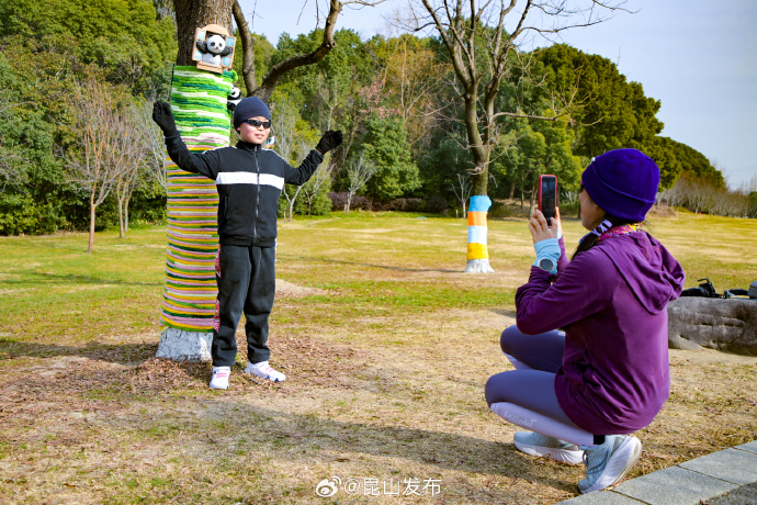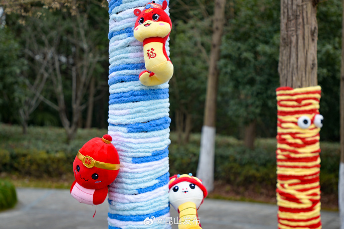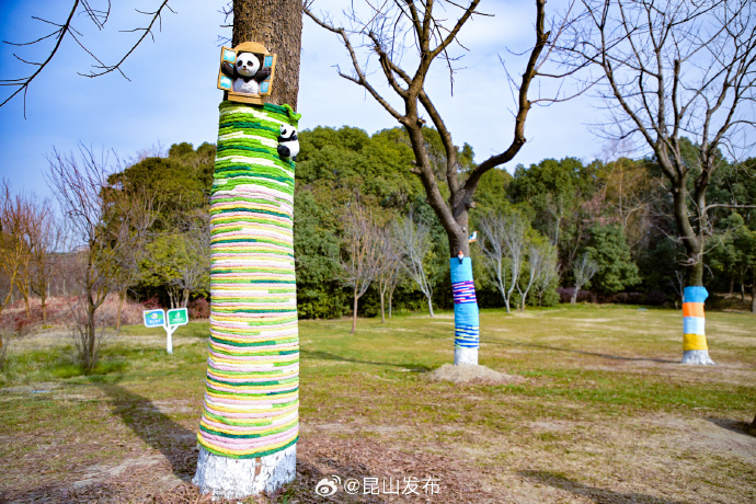 为迎接即将到来的新春佳节,昆山森林公园工作人员和游客们别出心裁,为树木穿上了一件件“多巴胺”毛衣,成为公园里一道独特的风景线!快来一起来看五颜六色、造型各异、可可爱爱的大树“多巴胺”时装秀吧~