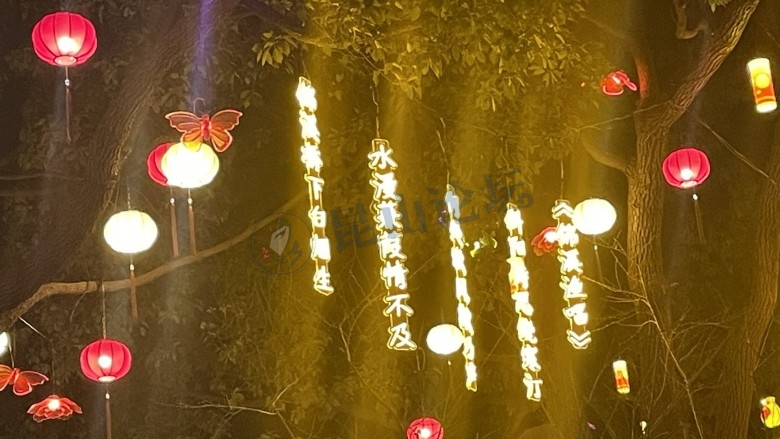 古镇的树上挂满了五颜六色的灯笼,还有古诗词哟!