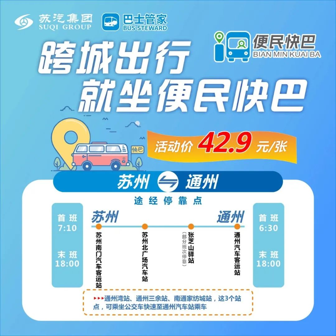 “便民快巴”活动价相当于班线票价的三分之二,具体为:苏州—南通39.9元,苏州—如东44.9元,苏州—通州42.9元,苏州—丰利44.9元,昆山—南通39.9元。