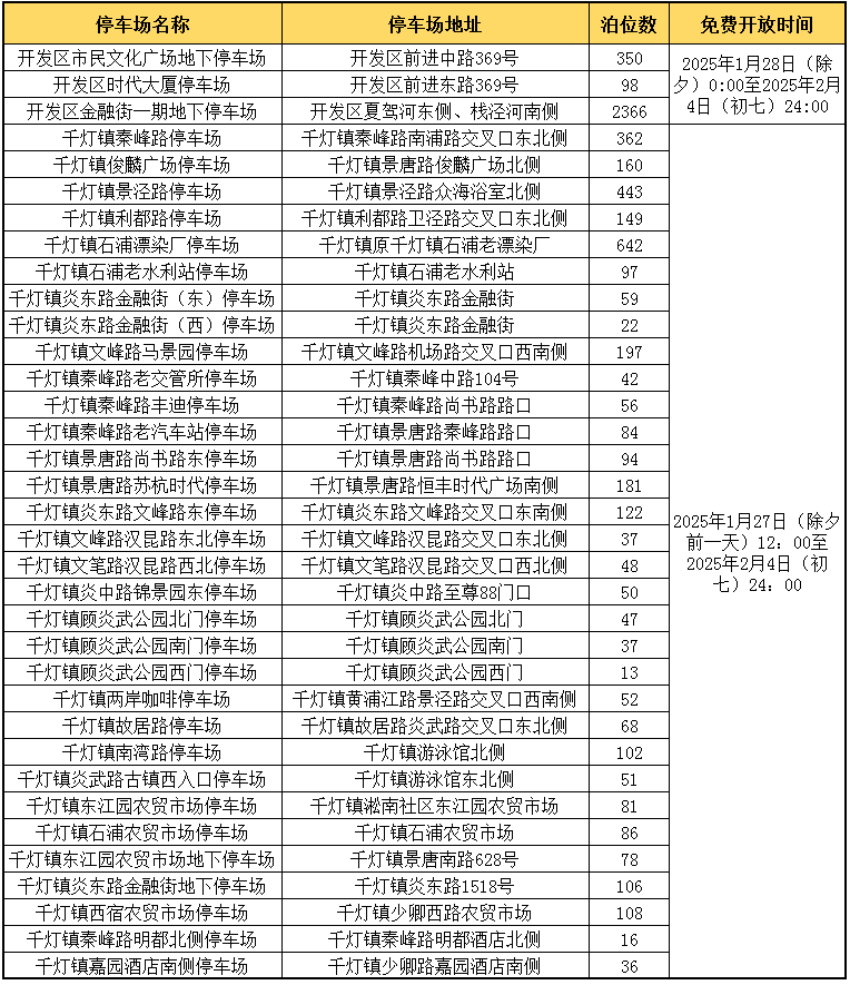 温暖过冬,祥和过年!为进一步提升市民在春节期间的出行便利性,享受更加便捷、舒心的出行体验,2025年春节期间,全市公共收费道路泊位和部分停车场,总计12828个泊位将实行免费停放优惠!