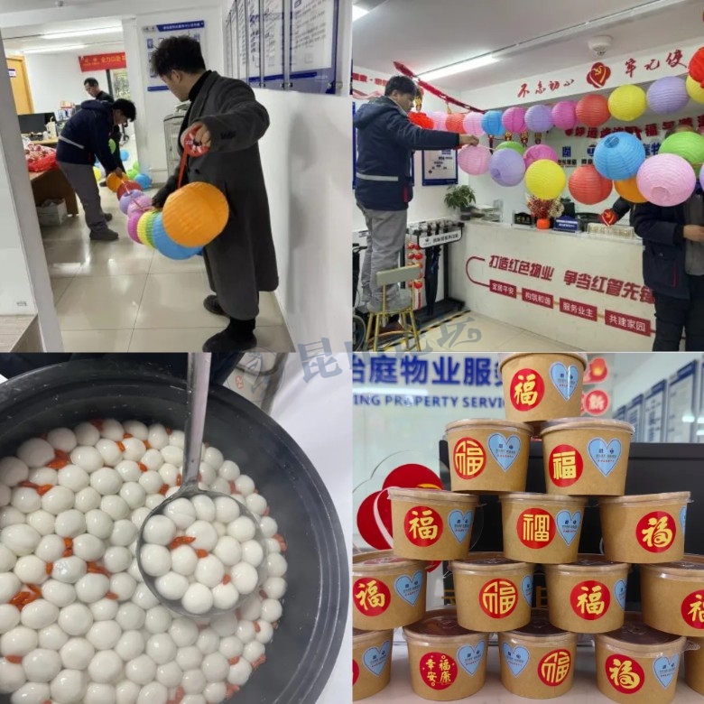 睿怡庭工作人员齐心协力早早的开始布置活动现场,有的参与挂五彩缤纷的灯笼,灯笼下缀着五颜六色的灯谜彩纸,节日氛围瞬间拉满;有的工作人员开始烧水,一锅一锅热气腾腾的汤圆装入带有福字的碗中,等着业主们来到活动现场。