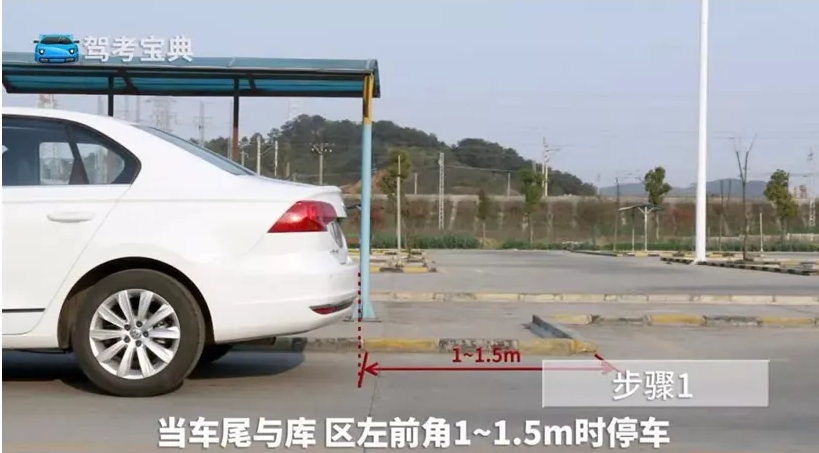 停车:观察左侧后视镜中车身与库边线基本平行,这个时候可以停车,不用再次回正方向。车身进库需停顿2秒,方可挂前进档。