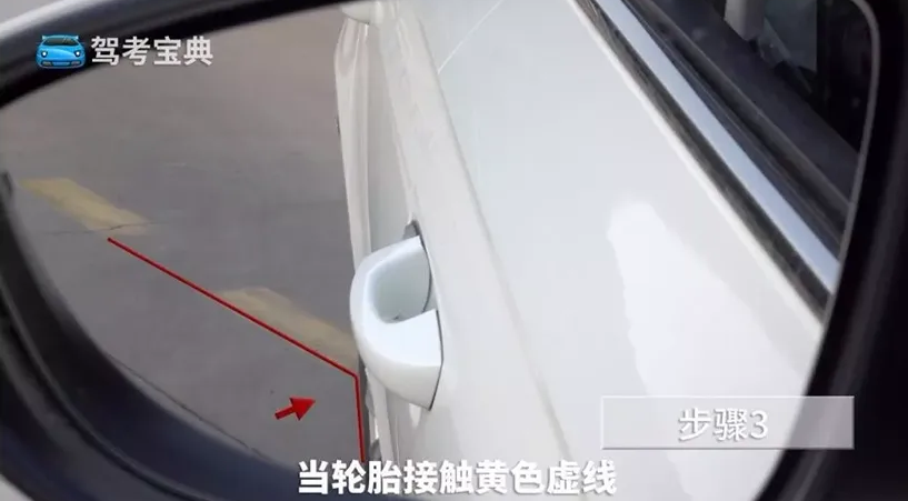 左打方向:从左后视镜看左后轮,看到压住左边的虚线,马上向左打死。