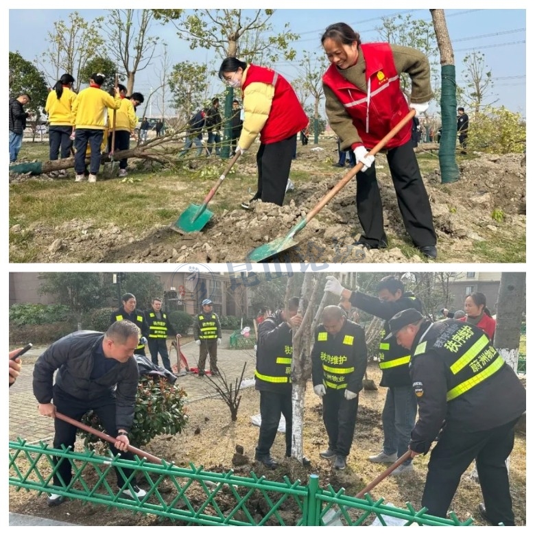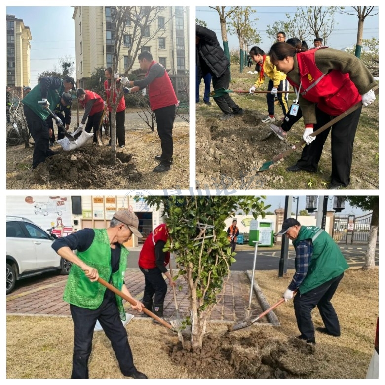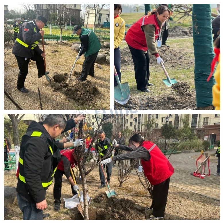 在植树现场,大家分工协作、挥锹铲土、培土浇水,一株株新栽的树苗迎风挺立,为小区增添了一抹勃勃生机。