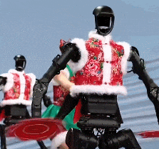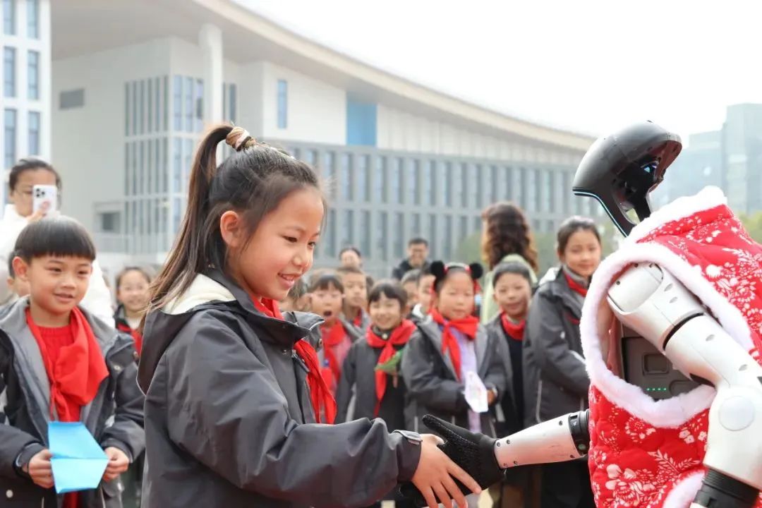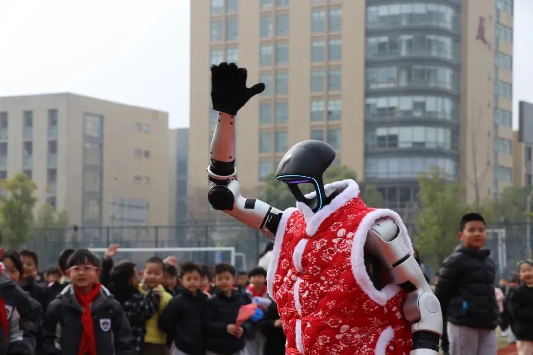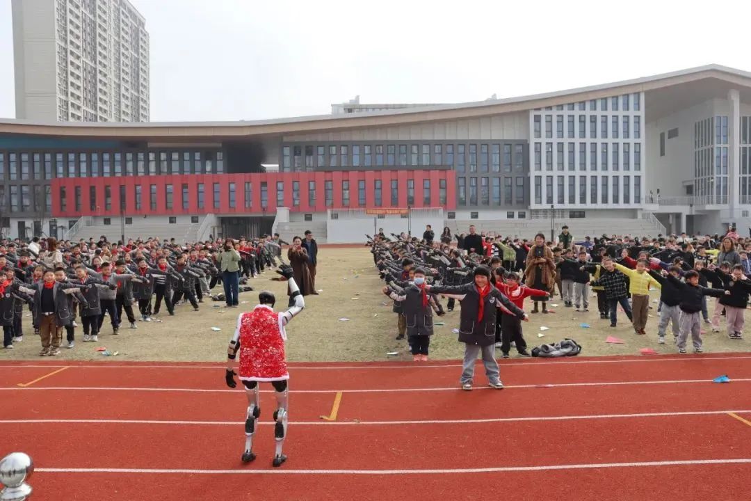 它时而挥臂和同学们一起练习武术操,时而与学生趣味互动,精准的动作与幽默的反应引发现场阵阵欢呼。