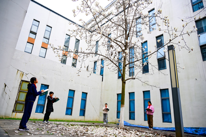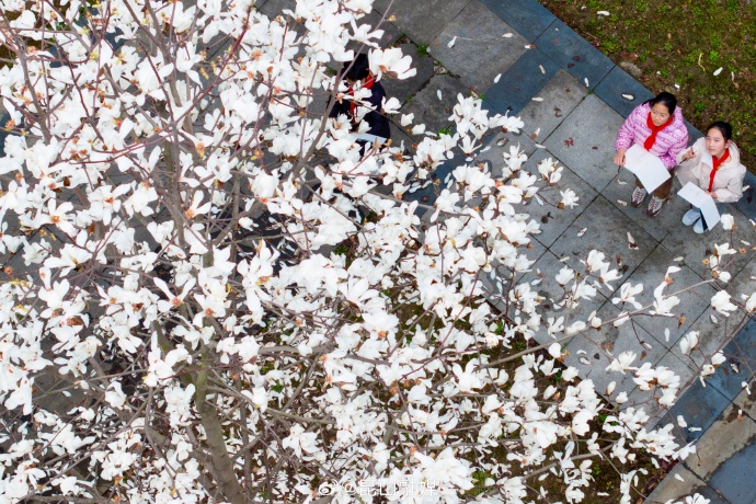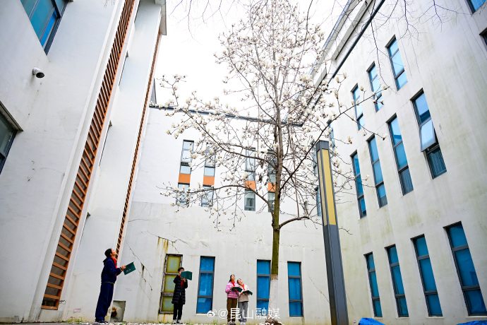 近日昆山巴城中心小学校园一角,几位美术爱好生在一株白玉兰下写生,记录春天美好景色。