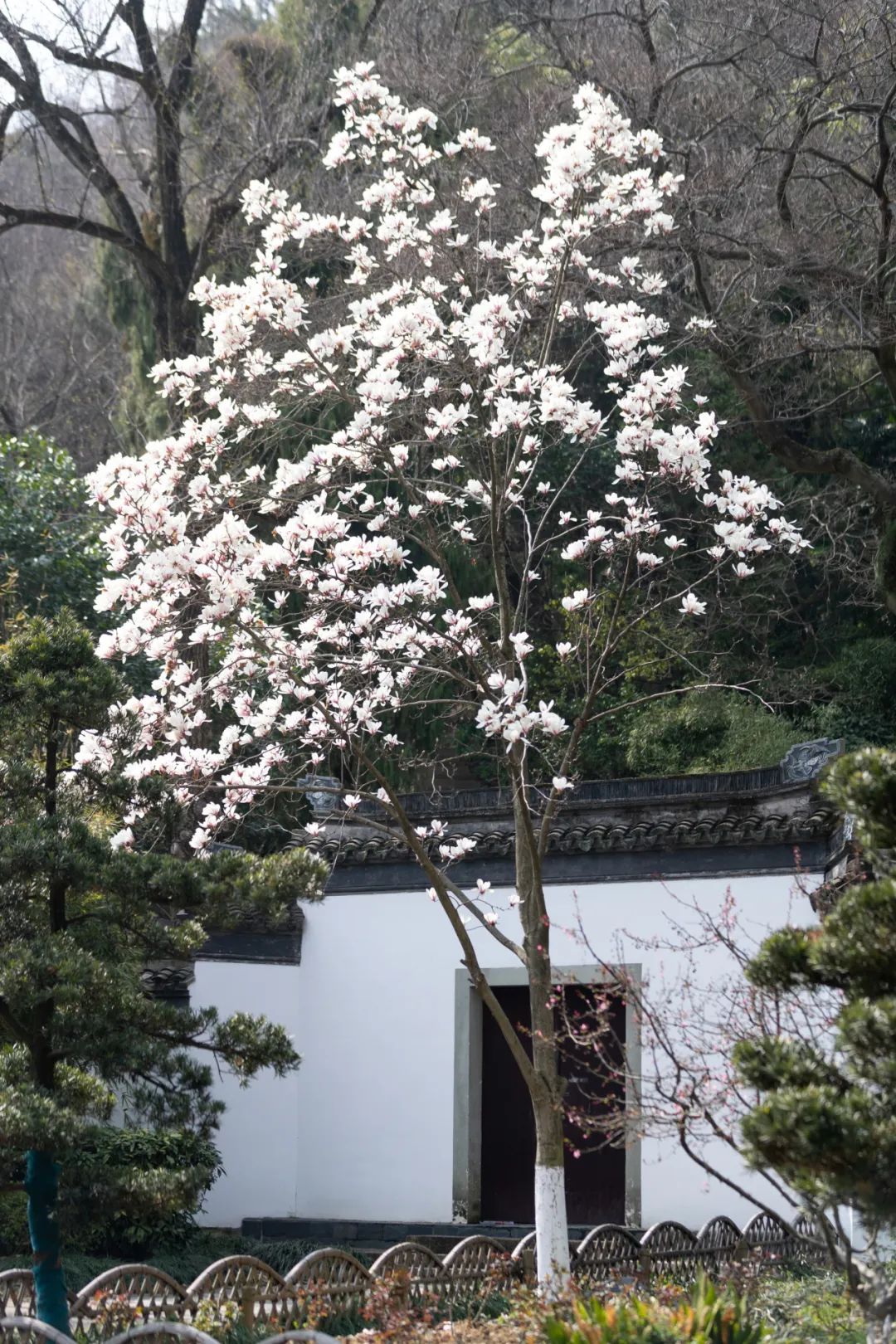白墙黑瓦与春花相互映衬