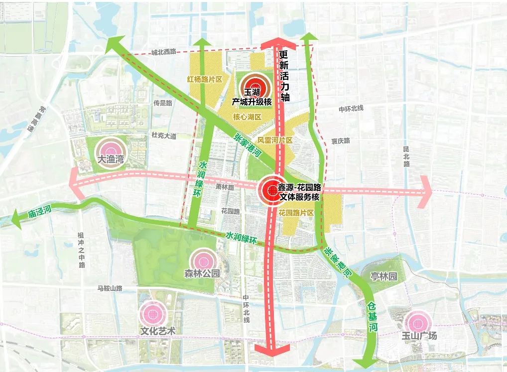 “一轴”为由寰庆路、鹿城路、城北路组成的更新活力轴,纵贯南北串联玉湖、风雷河、花园路、红杨路等重要更新片区;