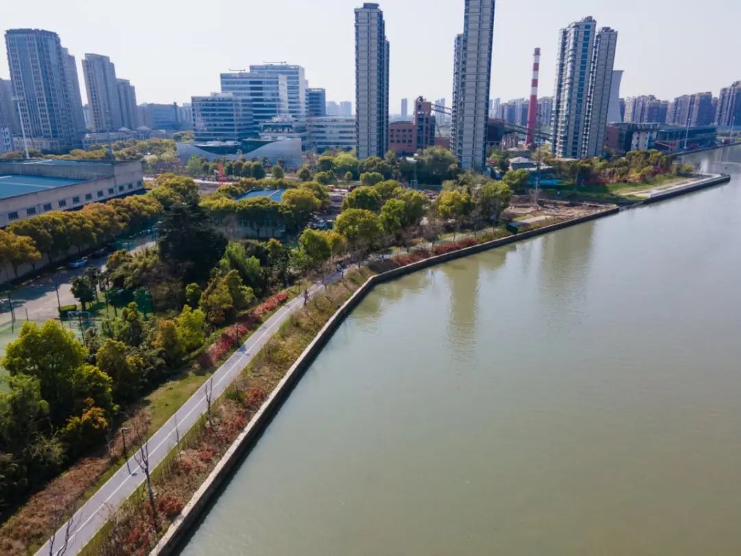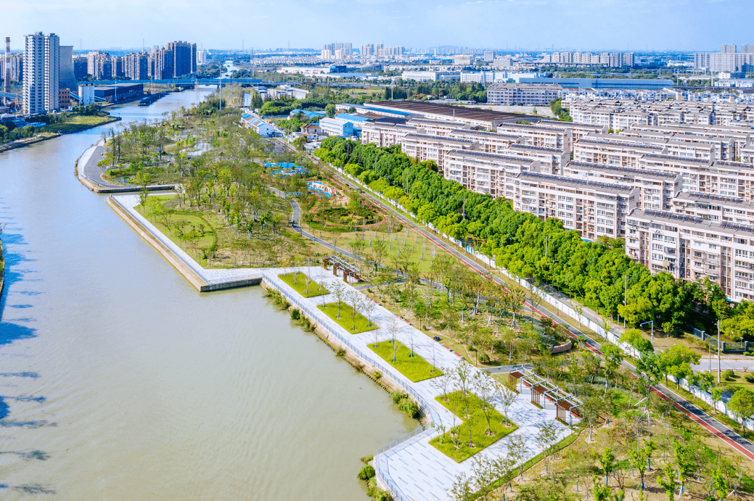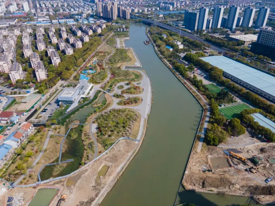 张家港河廊道沿河景观提升工程,打造一条集休闲、健身、观光于一体的怡人滨水绿廊。清澈的河水、葱郁的植被、盛开的繁花、蜿蜒的步道,构成了昆山城西一幅动人的生态画卷。