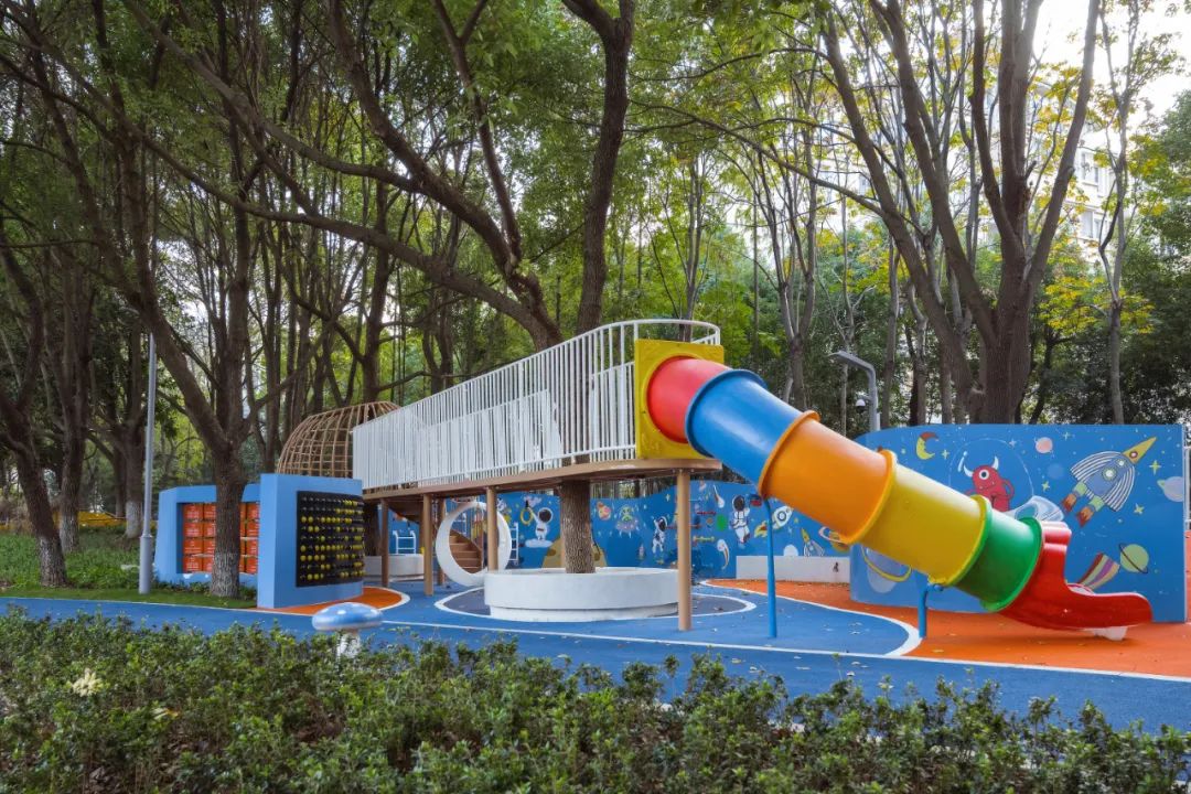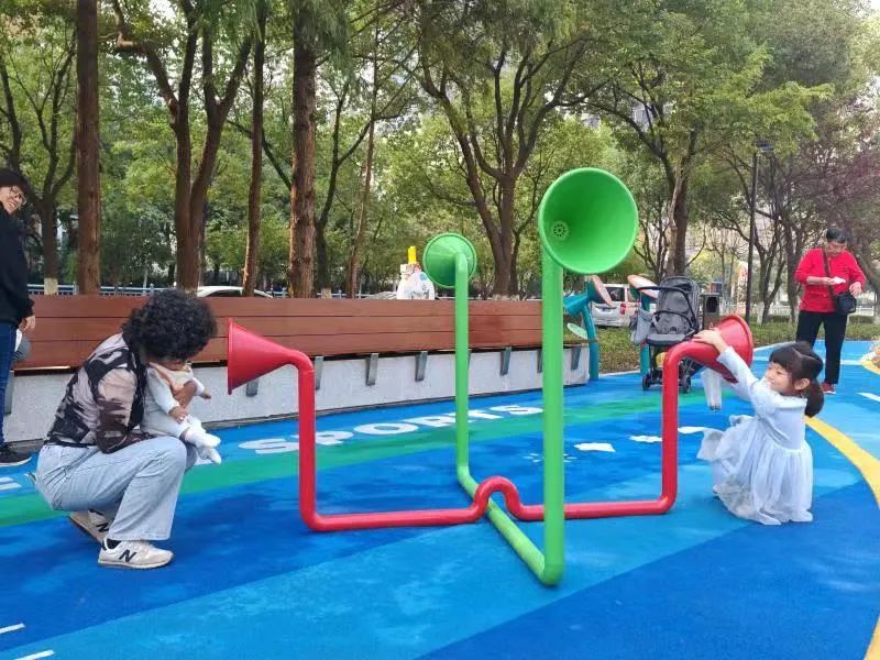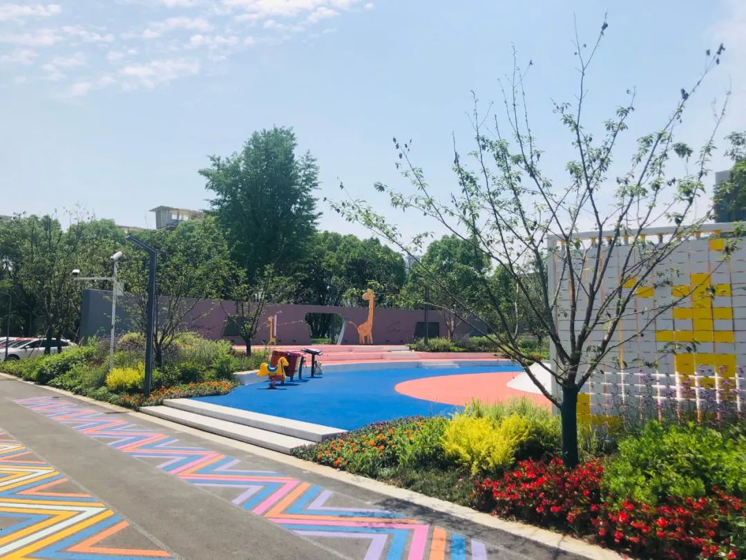 高新区吴思园作为儿童友好公园,开辟儿童活动区,设置了摇摇马、沙坑、攀爬架等设施,以满足儿童的玩耍和探索欲望。活动区色彩鲜明、童趣十足的设计,备受亲子家庭的青睐。