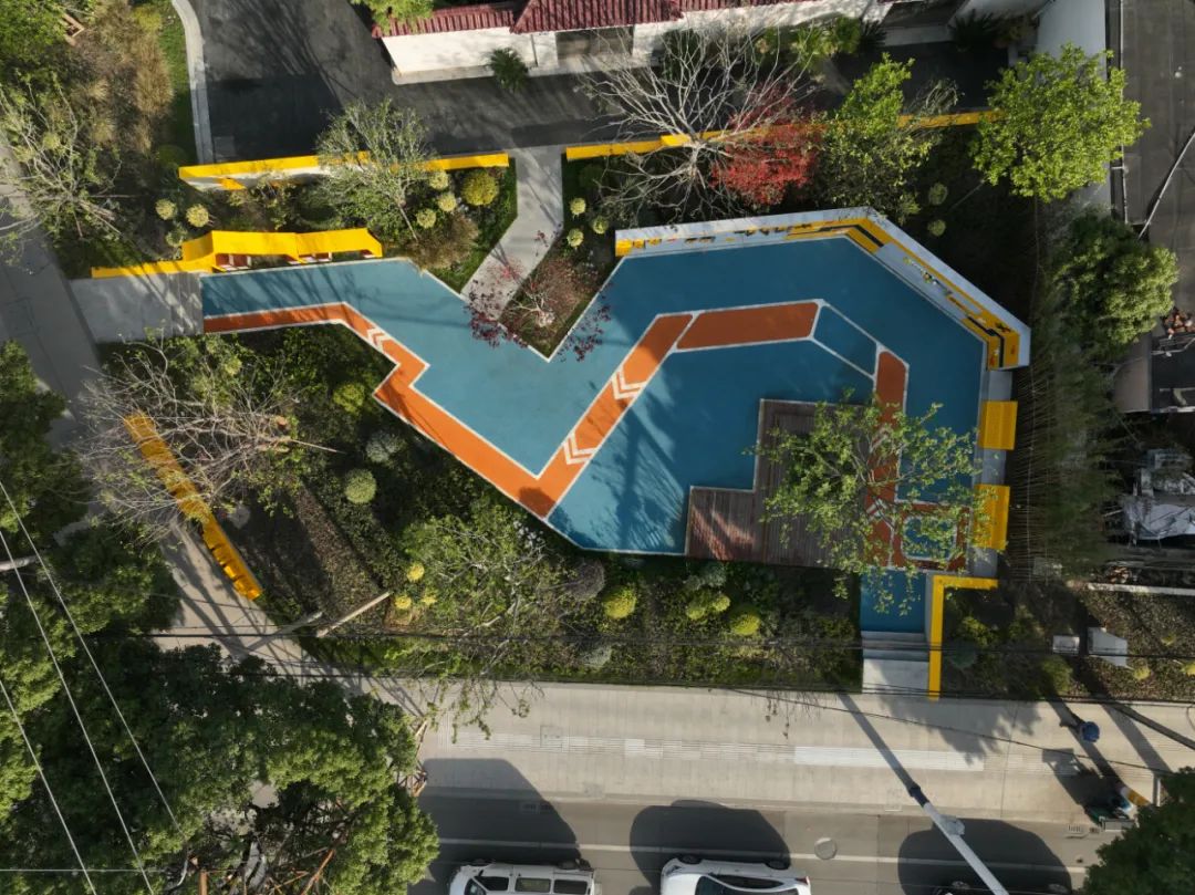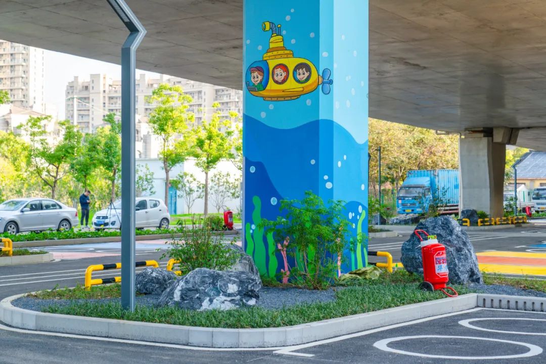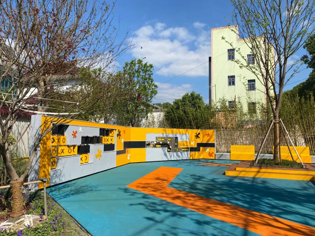 吴江区舜新南路口袋公园利用现场的高差变化,设计高低错落的趣味亲子活动空间;选用安全舒适的 EPDM 铺地;采用互动式景墙,提高参与性;选用开花观叶及闻香观果的植物,突出多彩和精致感。