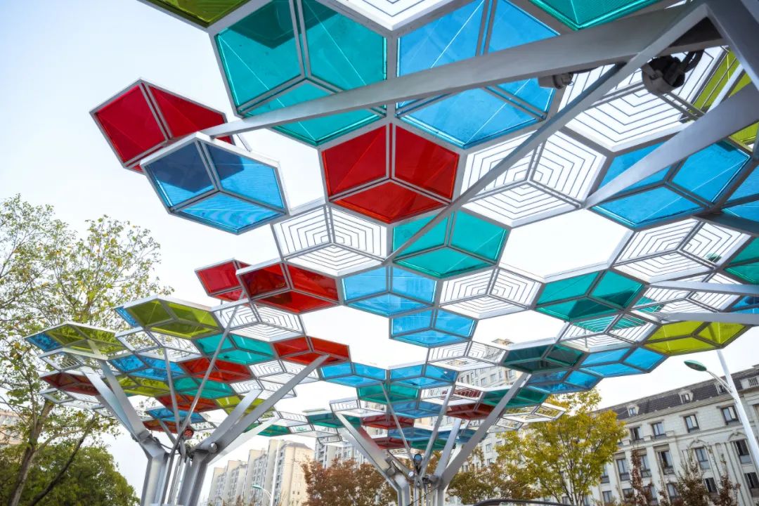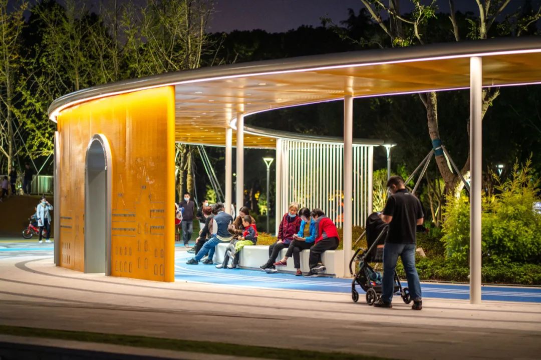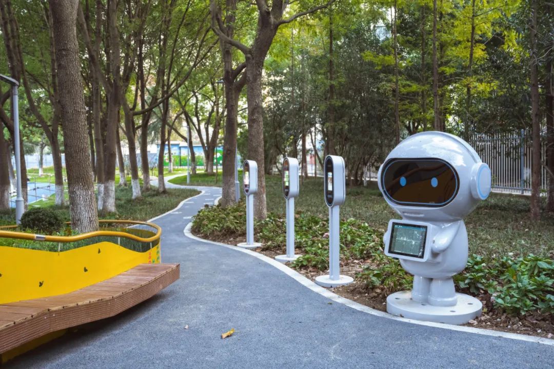 张家港市前溪儿童友好公园设有儿童游乐及自然科普教育区,通过彩色光伏玻璃景观构筑物、智慧灯杆、AI“智慧屏”互动装置、自然科普 AI 机器人教师等智慧设施,进一步增强公园的互动性和参与感。