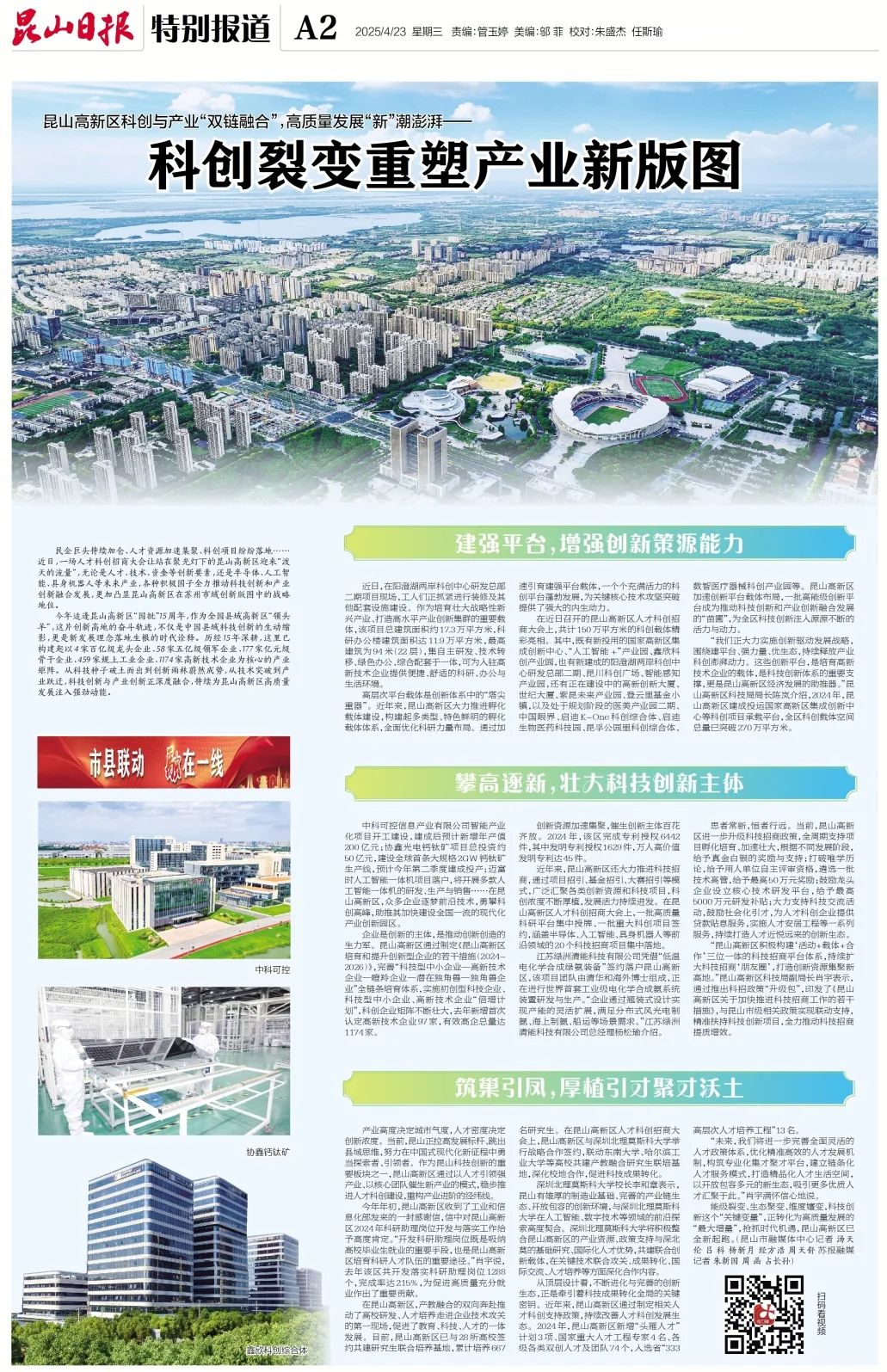 今年适逢昆山高新区“国批”15周年,作为全国县域高新区“领头羊”,这片创新高地的奋斗轨迹,不仅是中国县域科技创新的生动缩影,更是新发展理念落地生根的时代诠释。历经15年深耕,这里已构建起4家百亿级龙头企业、58家五亿级领军企业、177家亿元级骨干企业、459家规上工业企业、1174家高新技术企业为核心的产业矩阵。从科技种子破土而出到创新雨林蔚然成势,从技术突破到产业跃迁,科技创新与产业创新正深度融合,持续为昆山高新区高质量发展注入强劲动能。