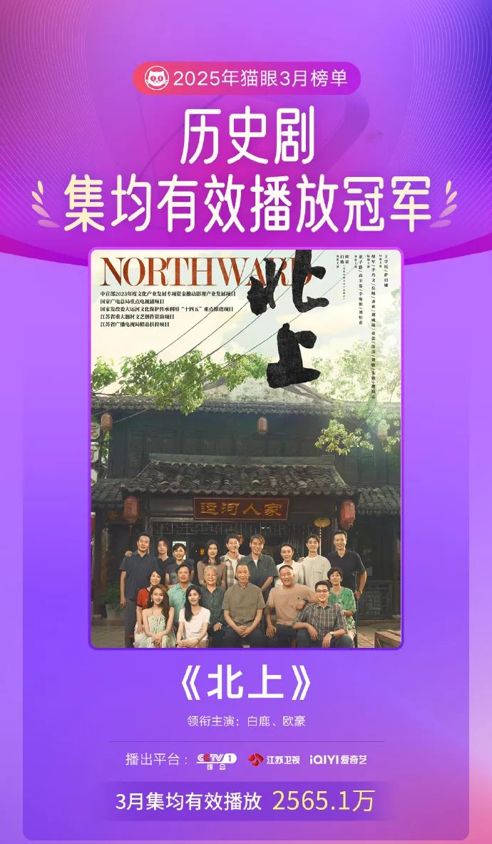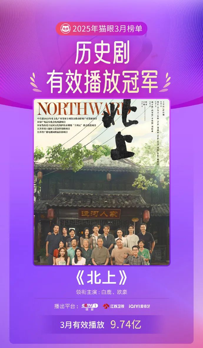 根据中国视听大数据显示,《北上》播出首日集均收视率3.929%,创下近三年黄金时段电视剧播出首日最高收视纪录。猫眼专业版数据见证,电视剧《北上》3月累计有效播放量9.74亿,集均有效播放2565.1万,成为2025年3月历史剧有效播放、集均有效播放榜双榜冠军。