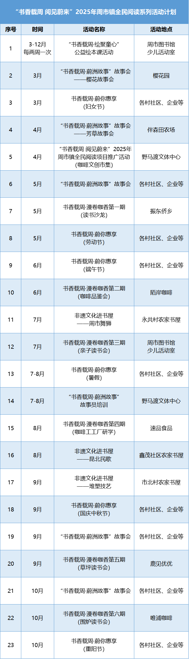 2025年周市镇全民阅读推广活动,规划落地南洋故事1923、唯浦咖啡、陌岸咖啡等6个“书香+咖香”融合阵地,以及陆杨粮仓构想几何BOOKS·粮仓书店、咖啡工坊等特色店铺,打造集图书展销、咖啡休闲、文创零售等多功能于一体的综合阅读新地标。结合“书香+咖香”阵地推出“书香载周·绘聚童心”“书香载周·漫卷咖香”“书香载周·蔚洲故事”“书香载周·蔚你惠享”“非遗文化进书屋”等系列活动,活动涵盖绘本阅读、咖啡主题阅读、周市故事传播、传统节日体验、非遗文化传承等丰富内容。