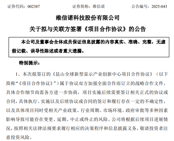 考虑到该项目对补强、壮大昆山开发区光电显示产业链有重大战略意义,同时能够延伸到集成电路、光伏等相关产业领域,是昆山建设新一代信息技术产业创新集群的重大项目,昆山经济技术开发区管理委员会为维信诺提供合作支持。双方将协调相关主体共同成立昆山全球新型显示产业创新中心项目公司。昆山经济技术开发区管理委员会协调国资平台进行出资。