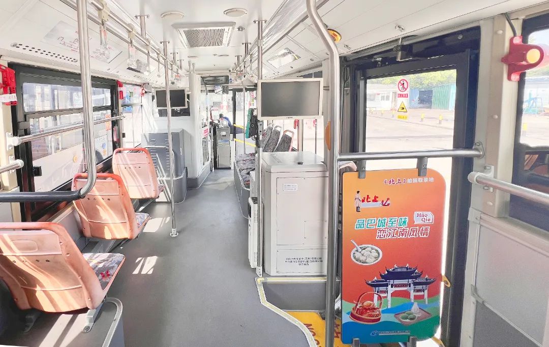 车厢内部装饰与车身相呼应,同样围绕巴城文化特色(如戏曲、非遗、市井烟火)打造专属文化空间,而内饰色调与车身蓝绿、橙色相协调,营造沉浸式江南氛围。