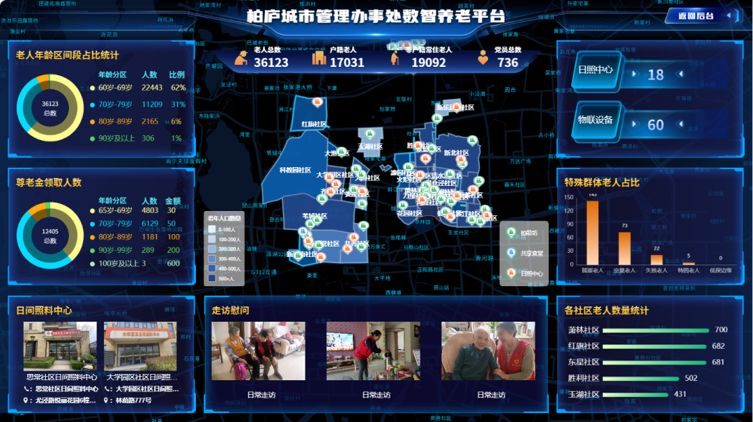 建立60周岁以上人群大数据服务管理档案,建设独居、孤寡等群体的关爱平台,覆盖34个社区、18家日间照料中心(助餐点),服务3.6万余名老年人。