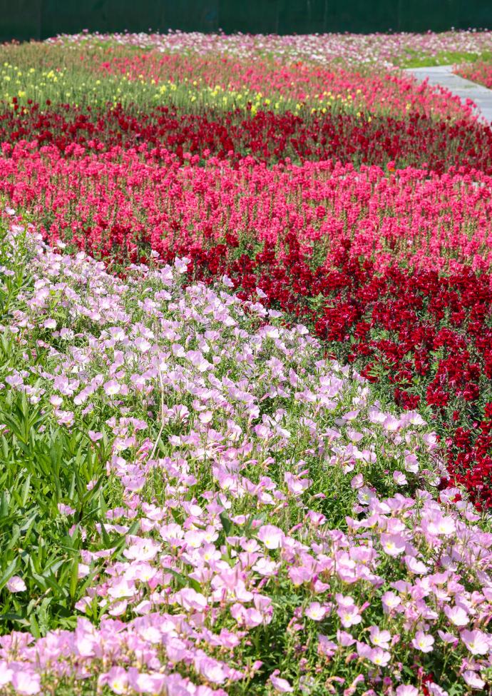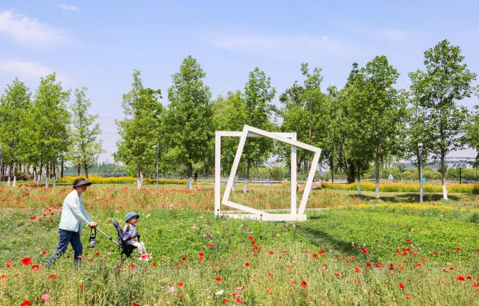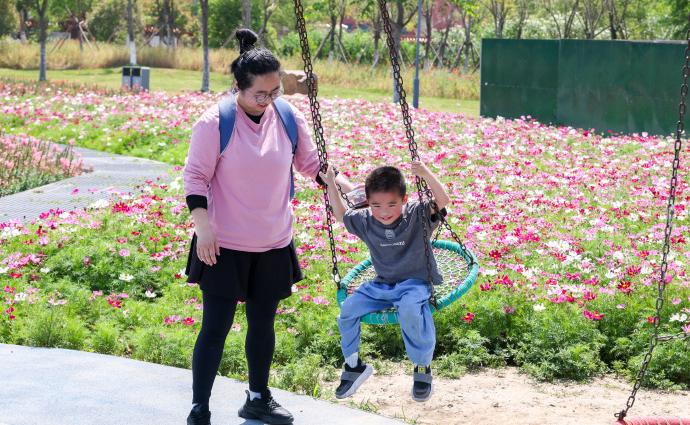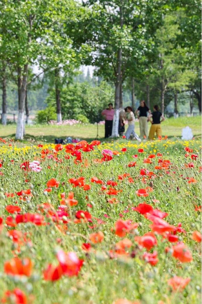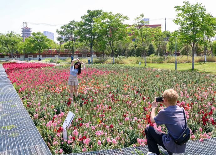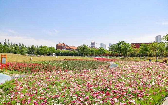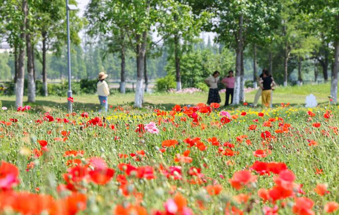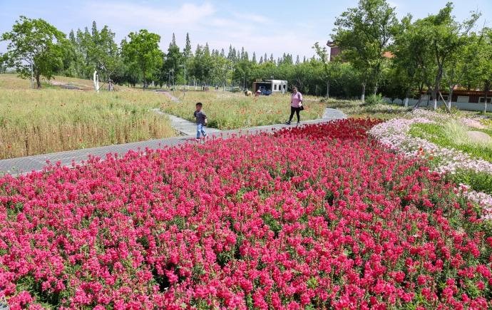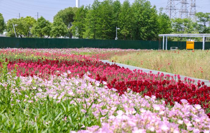 随着气温攀升,太仓塘滨水公园的慧聚花海迎来盛放期!柳穿鱼、红亚麻等花卉织就五彩画卷!