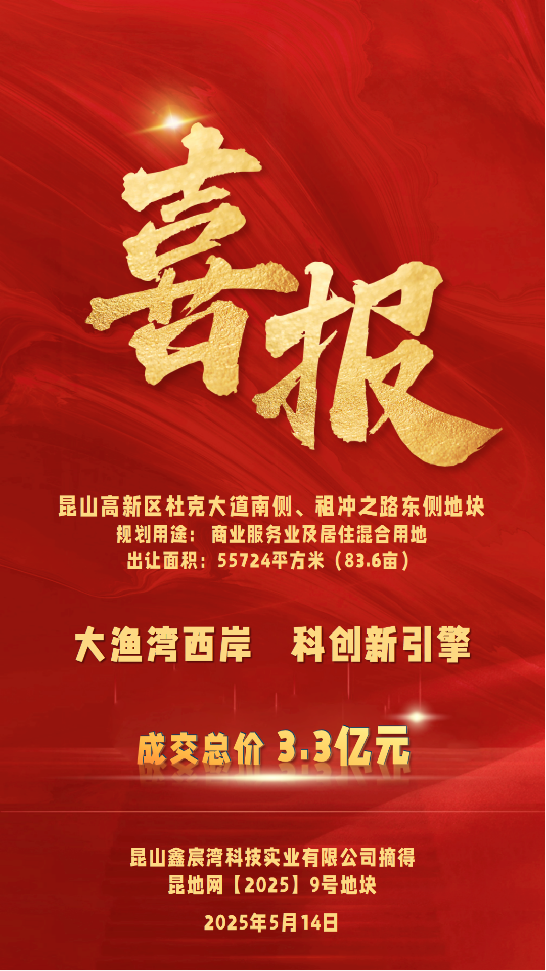 大渔湖核心地块——杜克大道南侧、祖冲之路西侧的昆地网[2025]挂字9号地块,由鑫宸湾科技实业有限公司以3.3亿元竞得,将用于建设“数字科技金融中心”项目,打造涵盖数字金融中心、高端人才社区、企业总部集聚区及滨水商业综合体等多重功能的综合体业态。项目建成后,有望成为大渔湖地块新地标,进一步推动昆山高新区产城融合与能级提升。