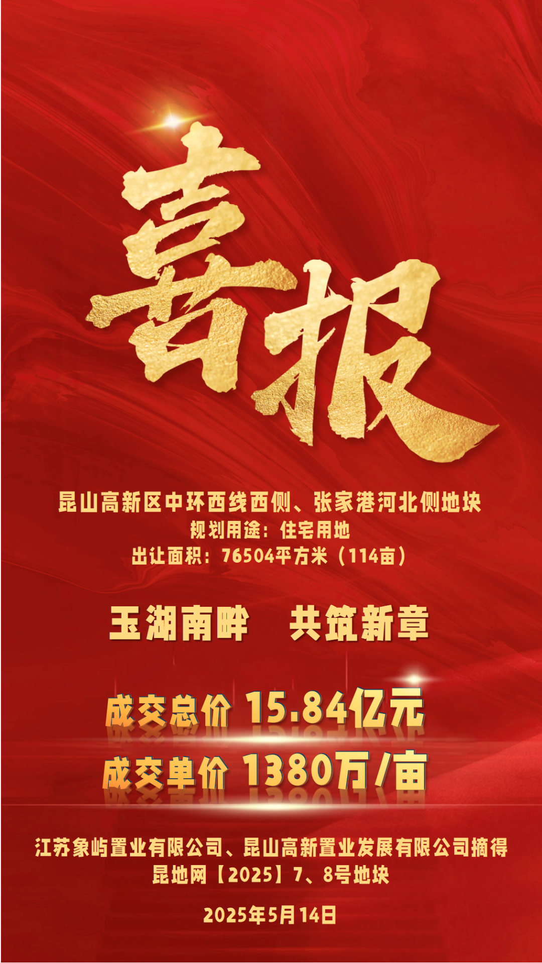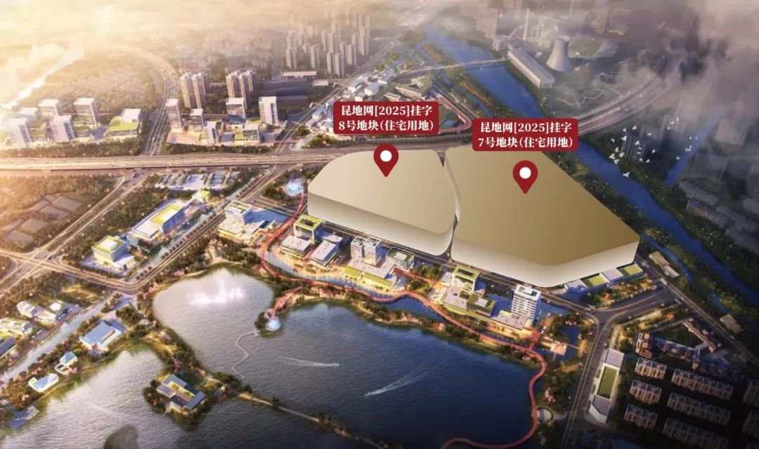 此次成交的3宗地块位于昆山高新区两大重要发展片区,通过市场化竞拍方式公开出让。其中,玉湖南侧昆地网[2025]挂字7号、8号两宗相邻宅地由世界500强企业象屿集团全资子公司象屿地产联合昆高新集团以15.84亿元包揽,将依托周边玉湖公园、张家港河生态廊道等生态资源,以及教育、商业、科创综合体等资源配套,打造高品质住房项目。