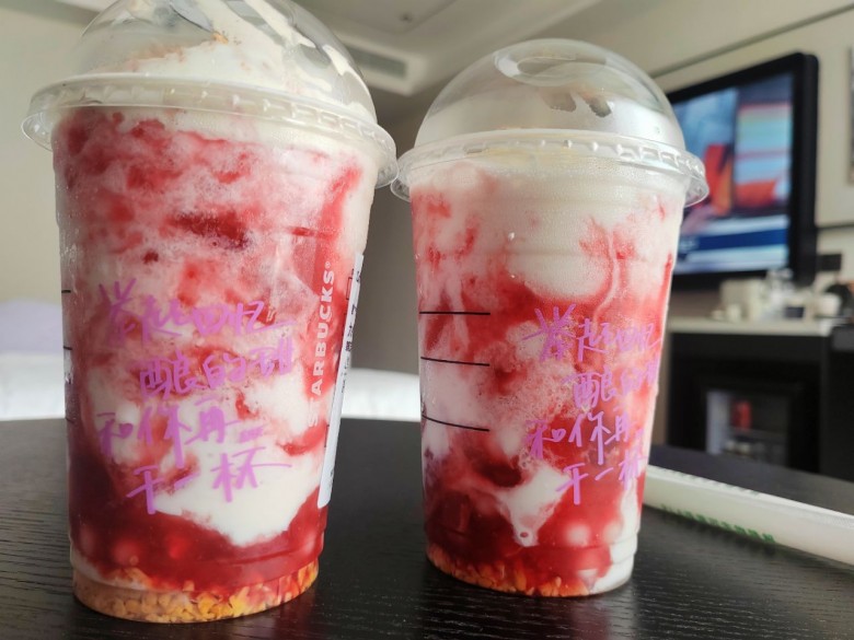 鸠羽千夜:为了五月天歌词联名杯,点了两杯草莓爆珠星冰乐(早上喝过一杯黑咖,下午不敢喝咖啡了[表情])[图片] (2025-05-17 15:58)