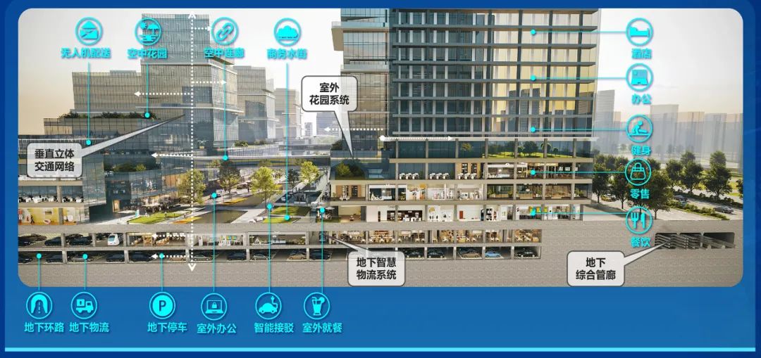 立体互联、智慧无限。青阳港中央商务区将采用复合交通,通过跨区微巴与地铁接驳,拓展轨交优势;建设2公里地下环廊,疏解地面交通,串联不同区块;5公里空中连廊,便捷办公交流,攀升多重视角,提升商业活力,兼顾运动健身;低空物流网络实现15分钟内智能配送。