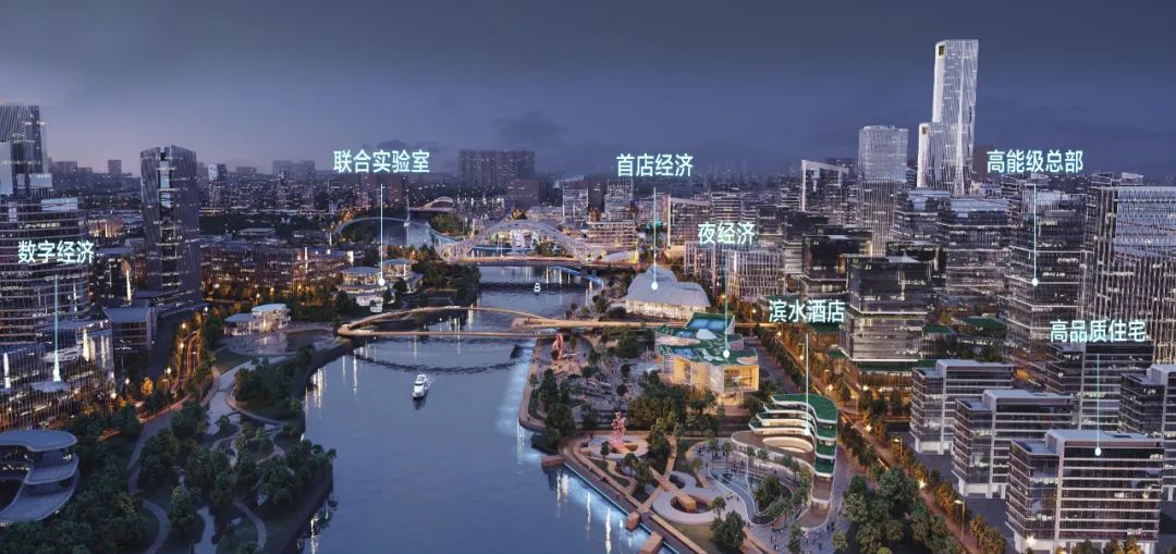 潮流集聚、滨水活力。青阳港中央商务区将利用滨水空间,招引高能级总部经济、数字经济产业,规划共享办公,发展首店经济、夜经济,通过亲水步道、艺术装置,打造沉浸式消费场景。